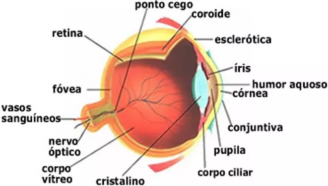 Pupila: Orifício central por onde passa a luz para encontrar o cristalino;
